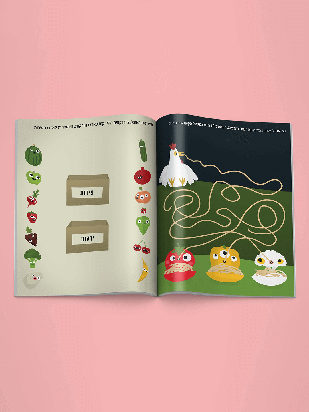 הדמויות בחוברת מלמדות את הילדים איך לעקוב אחרי מסלולים, איך לצייר קווים, למצוא הבדלים, לספור, לזהות קבוצות, ועוד, תוך כדי העברת מסרים חינוכיים של אהבת בעלי חיים ואכילה נכונה.